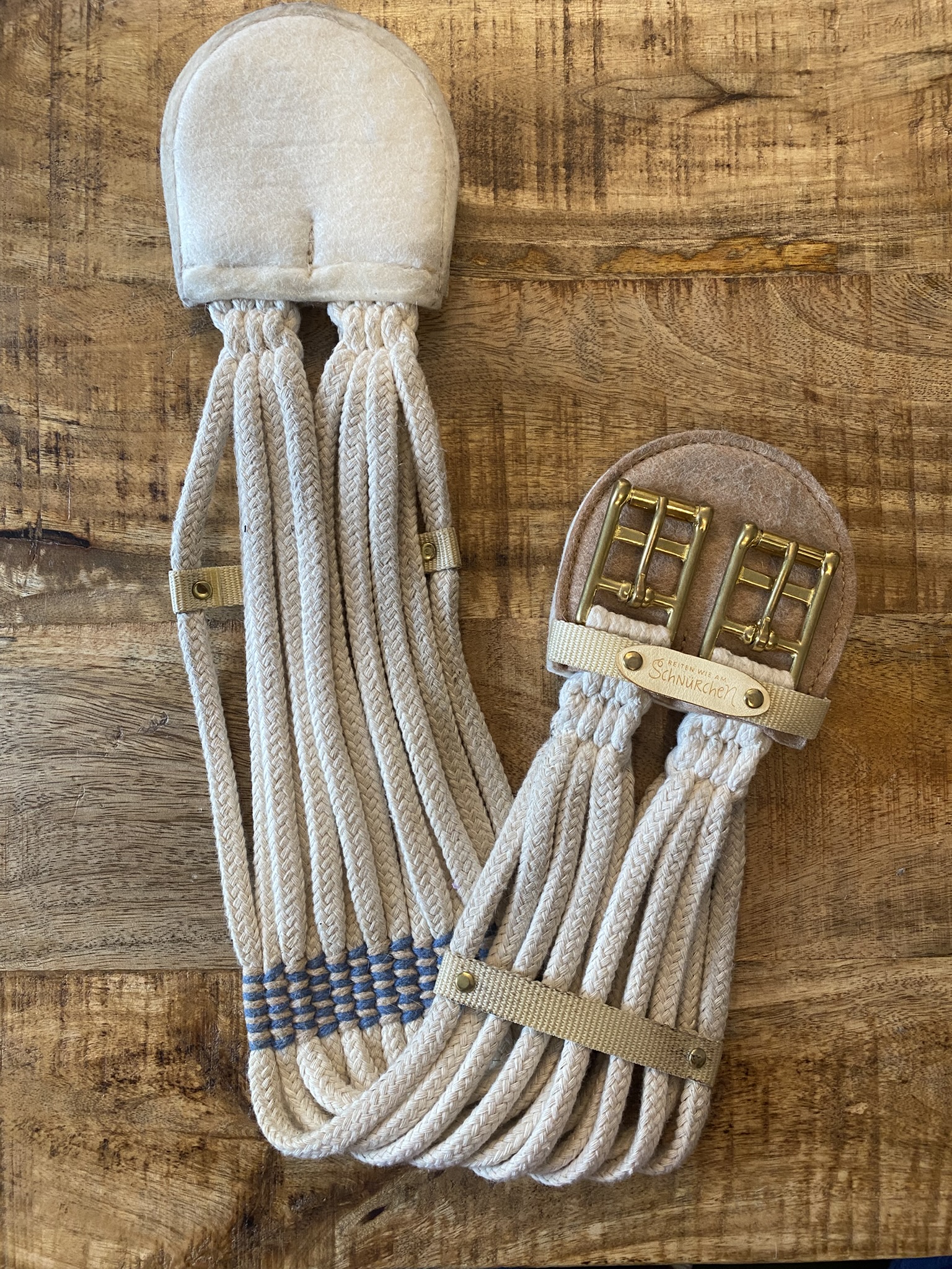 Baumwollkurzgurt in Natur mit sand- und mittelblauer Querwebung, sandfarbenem Schnallenschutz und Messingschnallen.