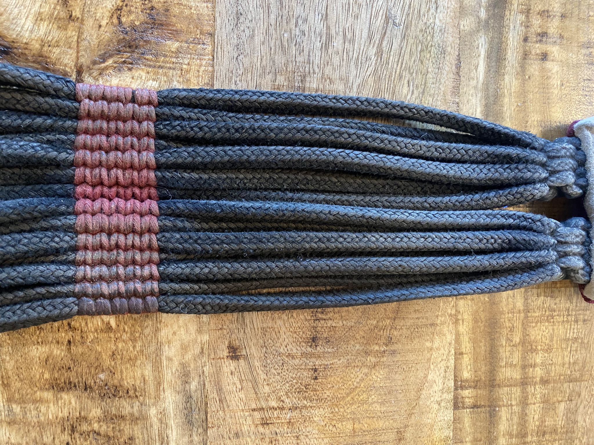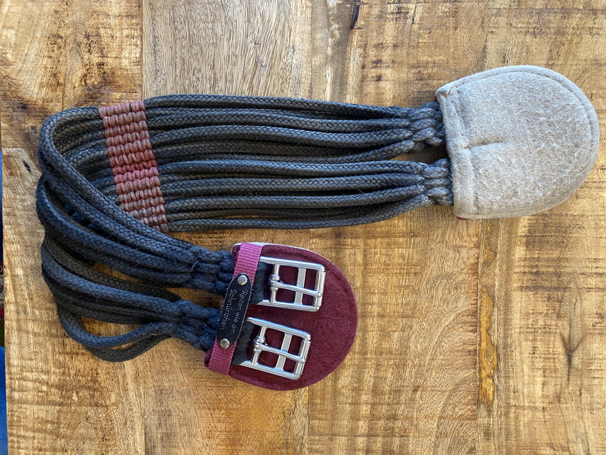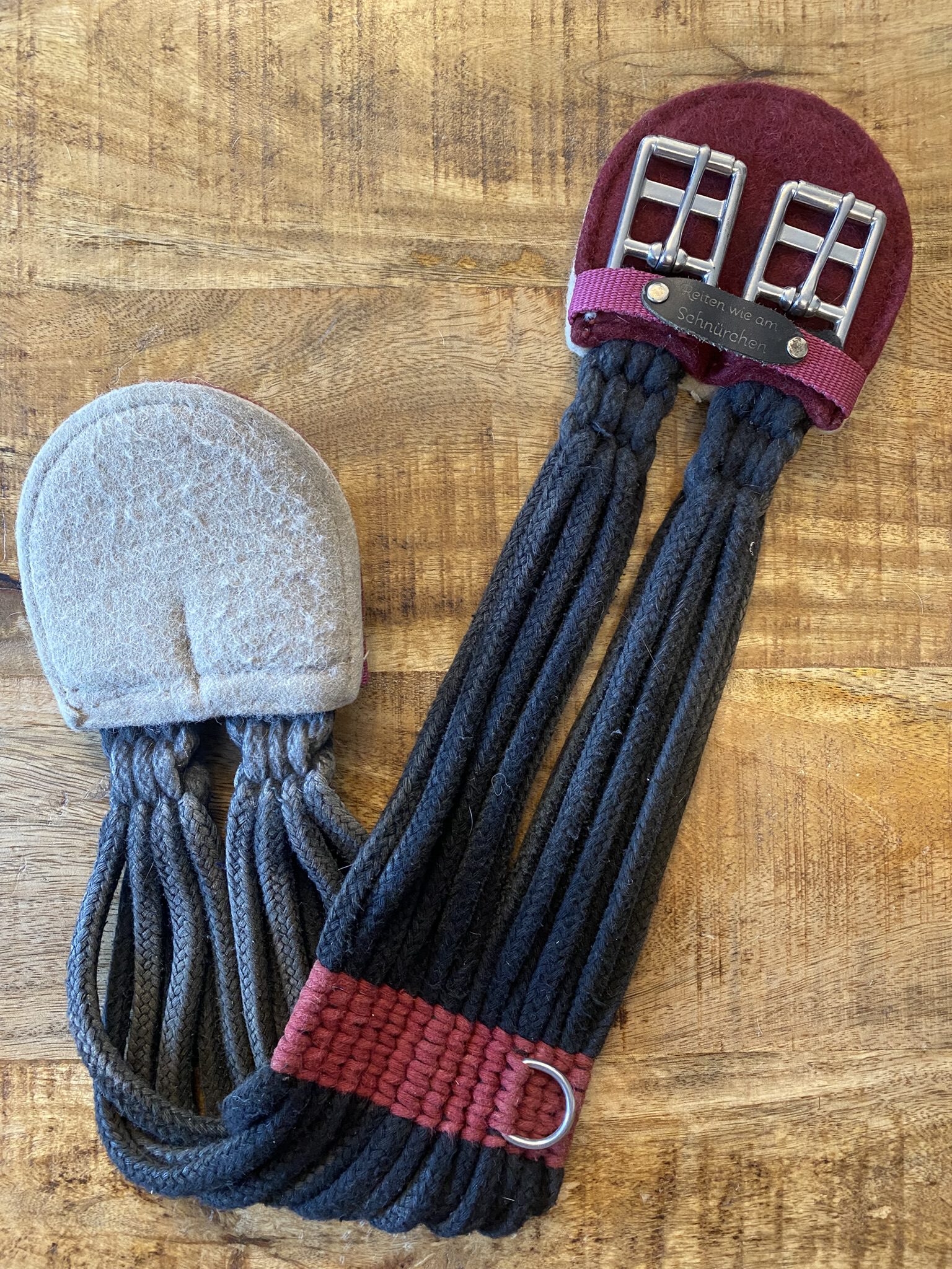 Der Schnurgurt hat Verschmutzungen, starke Gebrauchstspuhren sowie ein paar Haare.